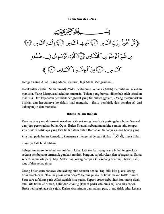 Walaupun kita tidak ada rakaman huraian pertama pada tahun 1962 itu. Tetapi melalui buku tafsir ini, kita boleh andaikan ia seakan sama pengisiannya di saat kali pertama diucapkan. Tambahan pula Tuan Guru mengaitkan pula hubungan Surah al-Nas dengan Surah al-Fatihah sebagai surah yang terakhir dan surah yang pertama.