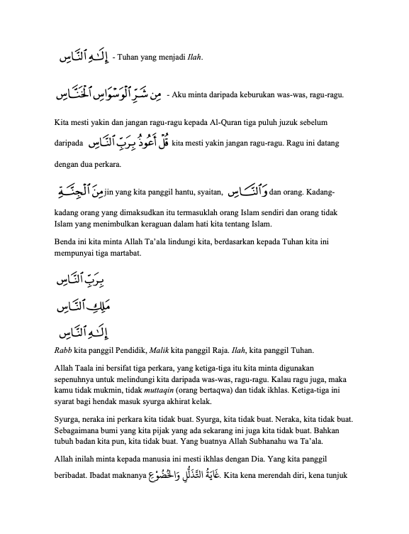Allah Taala bersifat tiga perkara. Rabb (pendidik), Malik (raja) & Ilah (tuhan). Ketiga-tiga itu kita minta digunakan sepenuhnya untuk melindungi kita daripada was-was & ragu-ragu.